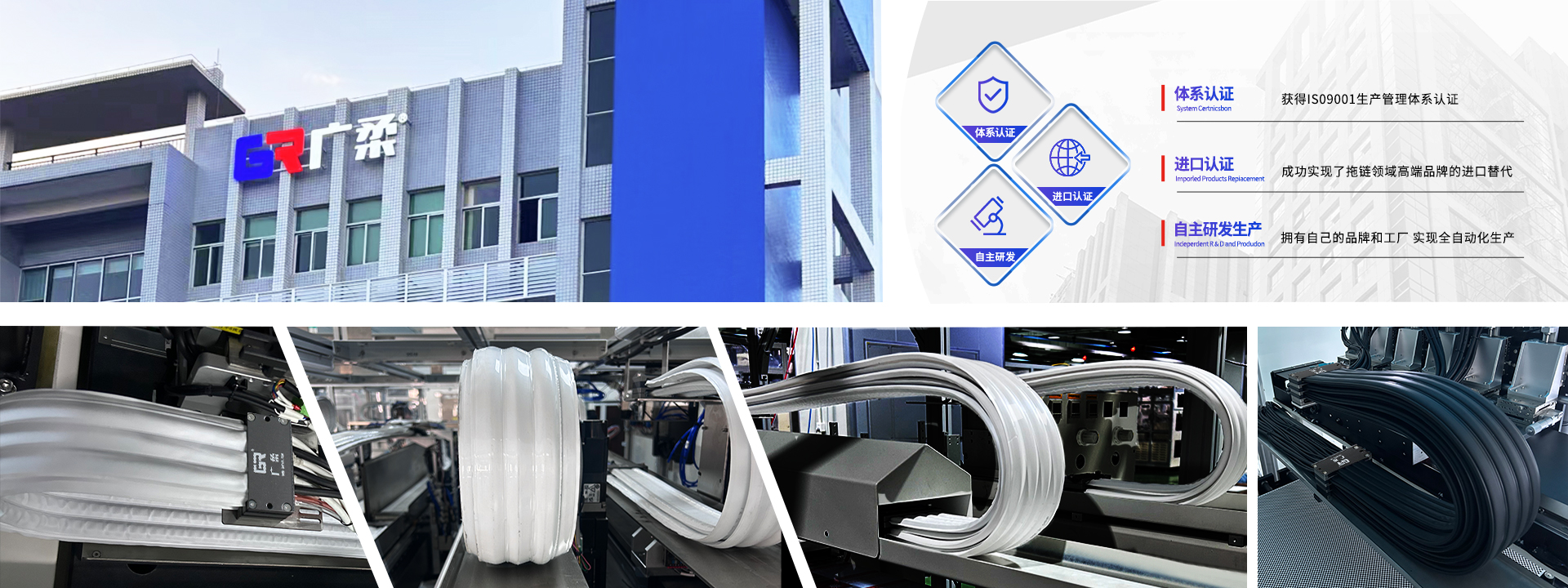 廣柔無(wú)塵拖鏈?zhǔn)腔葜葜锌浦悄芸萍加邢薰敬蛟斓臒o(wú)塵拖鏈品牌。中科智能成立于2019年,作為廣柔品牌的銷(xiāo)售中心,致力于企業(yè)產(chǎn)品在國(guó)內(nèi)外市場(chǎng)的推廣與應(yīng)用,并不斷優(yōu)化和提升品牌價(jià)值。2025年,廣柔在江蘇無(wú)錫成立了無(wú)錫廣柔技術(shù)有限公司,組建本地化團(tuán)隊(duì)服務(wù)華東地區(qū)客戶(hù)。廣柔無(wú)塵拖鏈產(chǎn)品具有CE、ROHS認(rèn)證,以及IPA、V0阻燃等級(jí)和SGS檢測(cè)報(bào)告,被廣泛應(yīng)用于潔凈室、半導(dǎo)體芯片、光學(xué)檢測(cè)、醫(yī)療設(shè)備和新能源等高新技術(shù)領(lǐng)域。無(wú)塵拖鏈作為潔凈室高端電纜運(yùn)動(dòng)系統(tǒng)的核心部件,具有耐磨擦、不釋氣、不積塵、防靜電、抗酸堿及老化等特性。中科智能依托關(guān)鍵材料技術(shù)及護(hù)套后端核心自動(dòng)化生產(chǎn)成型工藝,已建立潔凈自動(dòng)化車(chē)間,實(shí)現(xiàn)全自動(dòng)化生產(chǎn),并在質(zhì)量管控方面融入高穩(wěn)定性的科學(xué)方法,獲得ISO9001生產(chǎn)管理體系認(rèn)證。目前,廣柔無(wú)塵拖鏈的產(chǎn)品質(zhì)量和穩(wěn)定性位居國(guó)內(nèi)領(lǐng)先水平,已達(dá)到國(guó)際先進(jìn)標(biāo)準(zhǔn),成功實(shí)現(xiàn)了拖鏈領(lǐng)域高端品牌的進(jìn)口替代。